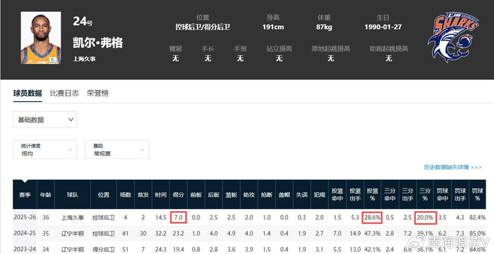 上海队除古德温可使用,但别的三个外助都不可,洛夫顿状况严重下滑,辽宁队旧将弗格更是严重下滑,比洛夫顿有过之而无不和。打了几个场角逐,弗格有三场得分4分4分和3分,此中有 一场4中0,活动战一分不得。到今朝为止,弗格场均只得7分,投篮射中率28%,三分射中率20%,可以称得上是断崖式下滑。弗格曾是辽宁队三连冠元勋,上季常规赛场都可以得23分,可是季后赛只得11分,反应了他的真实程度。