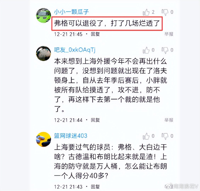 球迷也吐槽弗格,“上海签小王多好,弗格这两年都较着下滑严重了”、“上海缺的是控卫,像弗格这类锋卫在CBA已没法安身了,这赛季跟FIFA接轨,角逐时候缩短,小外助在场上比重更年夜,不克不及控场是不可的,更主要的是,弗格迟迟找不到得分手感”、“弗格可以退役了,打了几场烂透了”。卢伟觉得捡到宝,本来弗格是一坨......不知卢伟签弗格悔怨了没有?这事,大师怎样看?